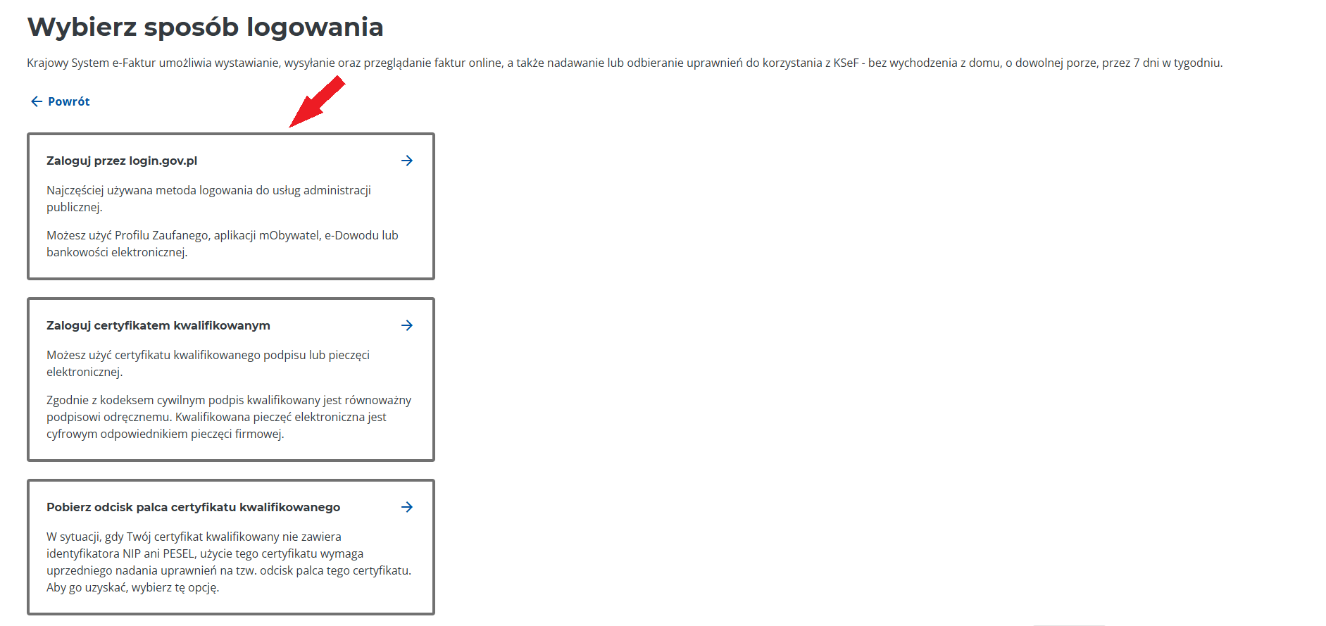 3. Click the option “Uwierzytelnij się w Krajowym Systemie e-Faktur” („Authenticate in KSeF”).