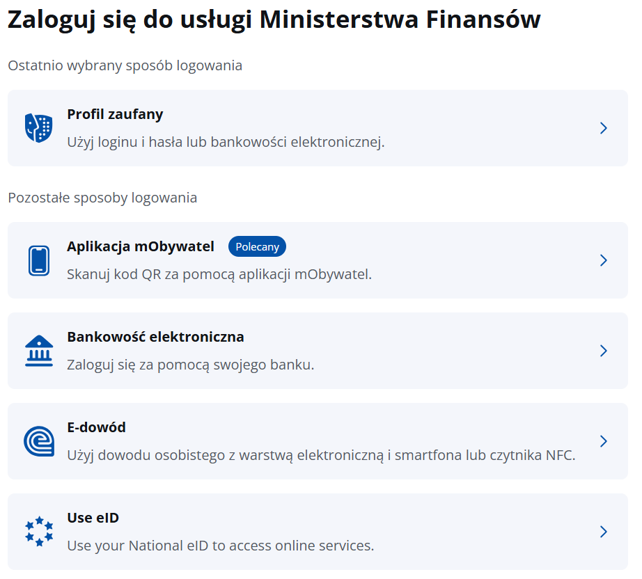 7. Select your login method. The available options are: Trusted Profile (Profil Zaufany), mObywatel app, online banking (bankowość elektroniczna), e-ID (e-Dowód), and Use eID.