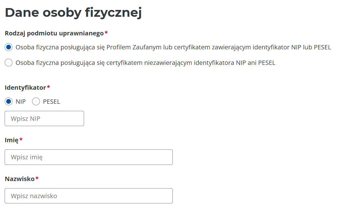 ii. Select the box “Osoba fizyczna posługująca się Profilem Zaufanym lub certyfikatem zawierającym identyfikator NIP lub PESEL” (“Natural person using a Trusted Profile or a certificate containing a NIP or PESEL number”) and fill in the fields: NIP or PESEL, imię (first name), nazwisko (surname).