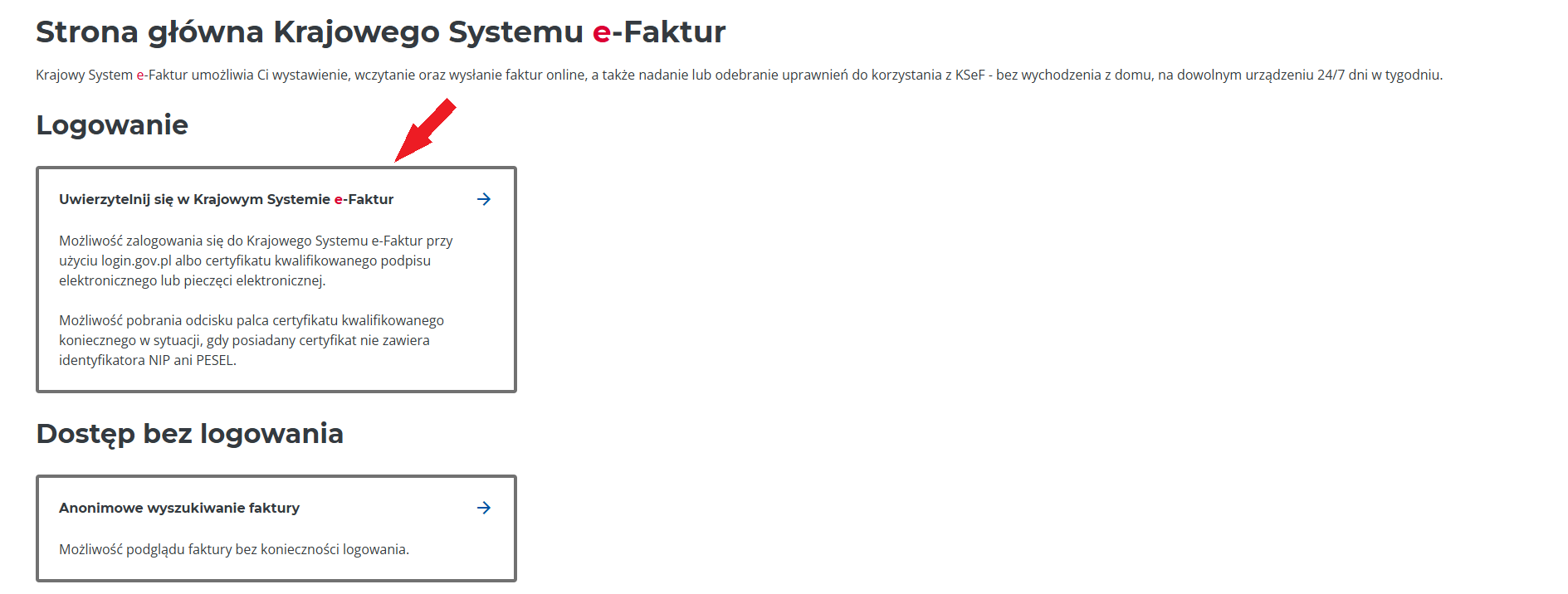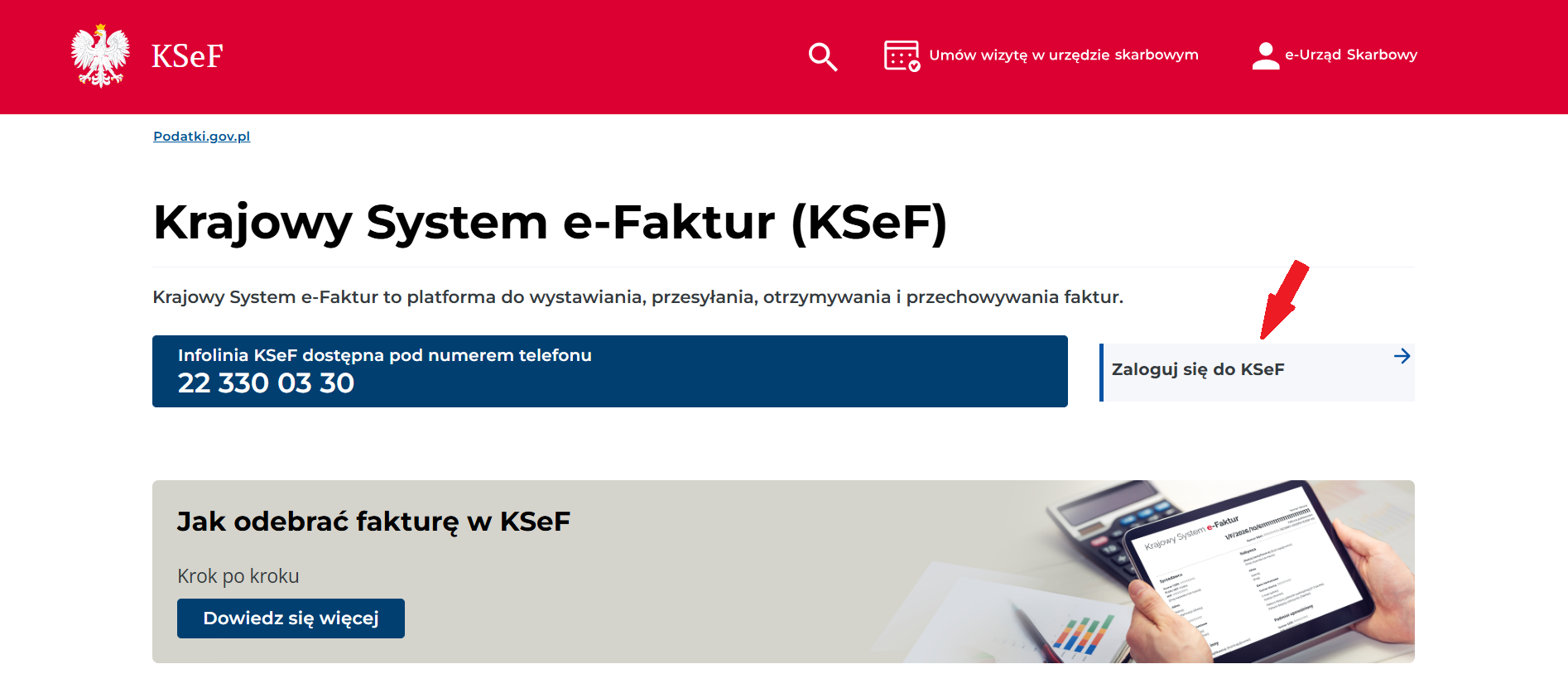 2. Click the “Zaloguj się do KSeF” (“Log in to KSeF”) button (marked with the red arrow).