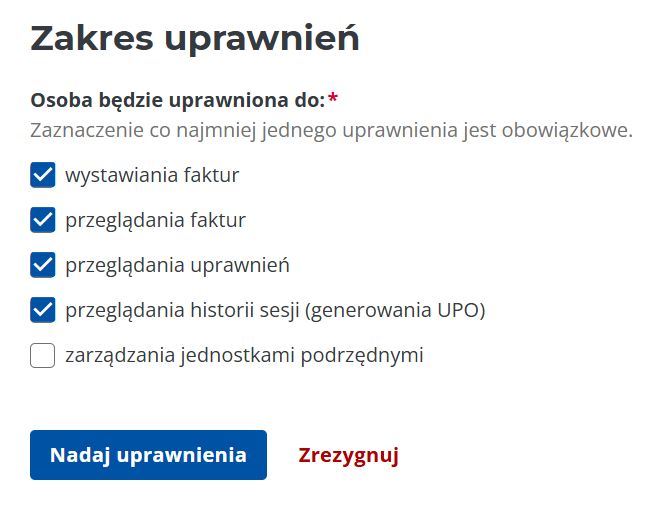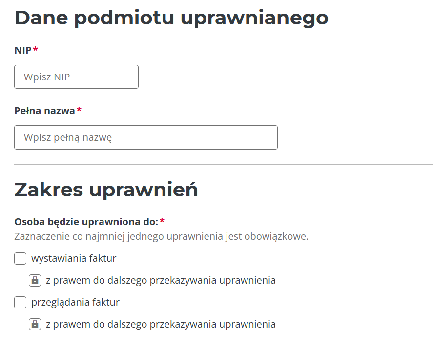 - Entity to issue and view invoices (Podmiotowi do wystawiania i przeglądania faktur) – used to grant permissions to an entity, e.g. an accounting firm